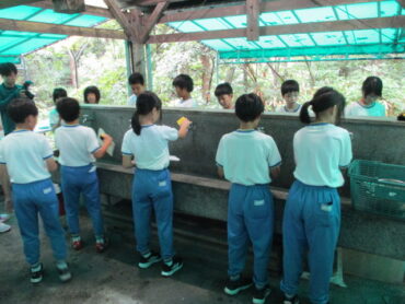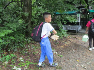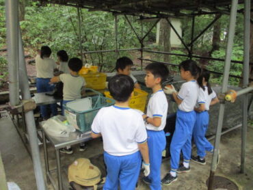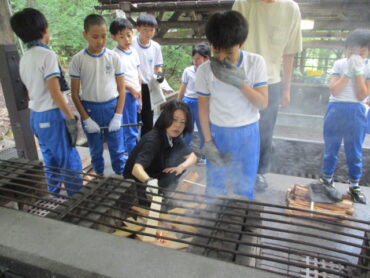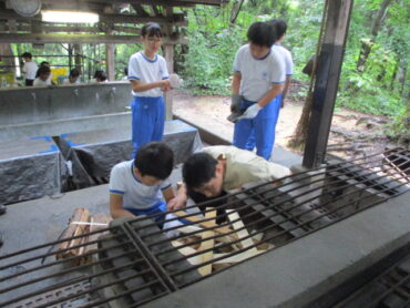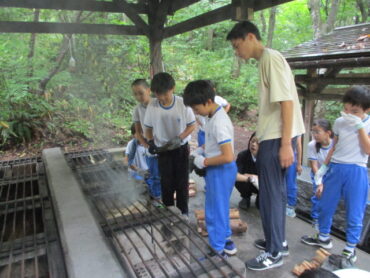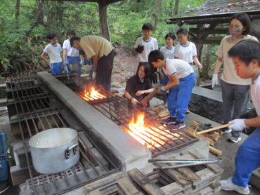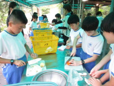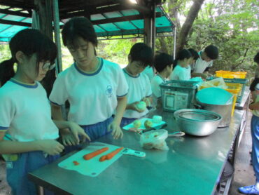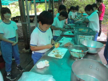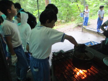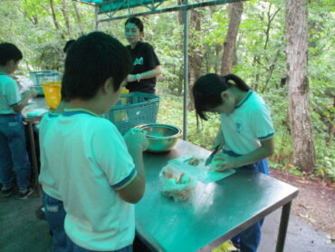 班の中で係分担が決まっています。道具を洗う人、野菜を切る人、火をおこす人など、みんなてきぱき動いています。