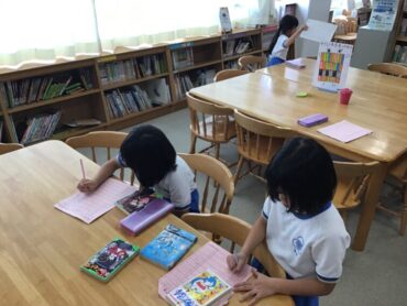 図書室で本を読んだり、教室内でボードゲームをしたりして楽しむ子供たち。