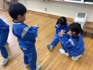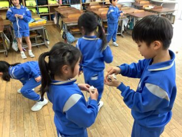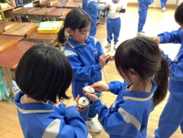 2026.2.3 NEW 1年生 ○1年生 生活科「こま回し」 生活科では、コマの回し方について学習しています。 最初に、コマ回しが得意な子供たちが上手に回すためのポイントを説明してくれました。 教えてもらったことを意識しながら練習開始です! 友達同士で教え合ったり、声を掛け合ったりするなど、仲よく協力してコマ回しに取り組む子供たち。 最初はうまく回すことができなかった子も、繰り返し練習を重ねるうちに少しずつコツをつかみ始め、とても嬉しそうな表情を見せてくれました。