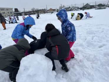 たくさんの雪が積もり、絶好の雪遊び日和ということで、グラウンドで雪遊びを行いました。