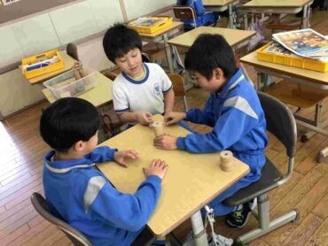 2026.2.16 NEW 1年生 ○1年生 生活科「むかしあそび」 生活科で「むかしあそび」の学習をしています。 自分が挑戦したい遊びのところに集まって活動をしました。 ☆けん玉 ☆だるま落とし ☆こま回し ☆いぬぼうかるた ~子供たちの感想~ 👧(けん玉)「けん先に乗せることができたよ。」 👦(だるま落とし)「上手に落とすコツは、ハンマーを早く動かすことだと分かったよ。」 👧(こま回し)「練習をたくさんしたら、前よりも上手に回せるようになって嬉しい。」 👦(いぬぼうかるた)「真剣勝負ができて楽しかった。」